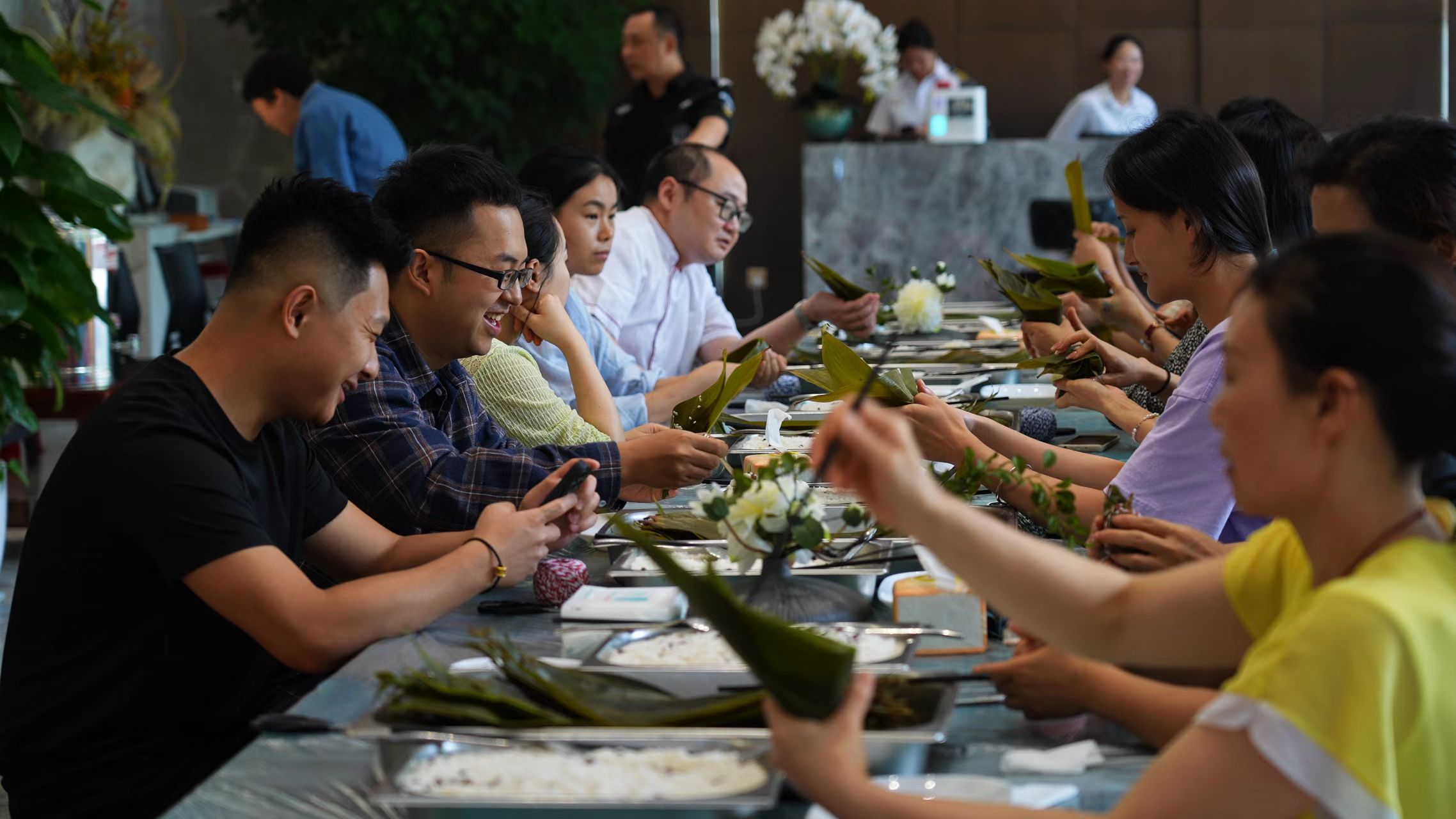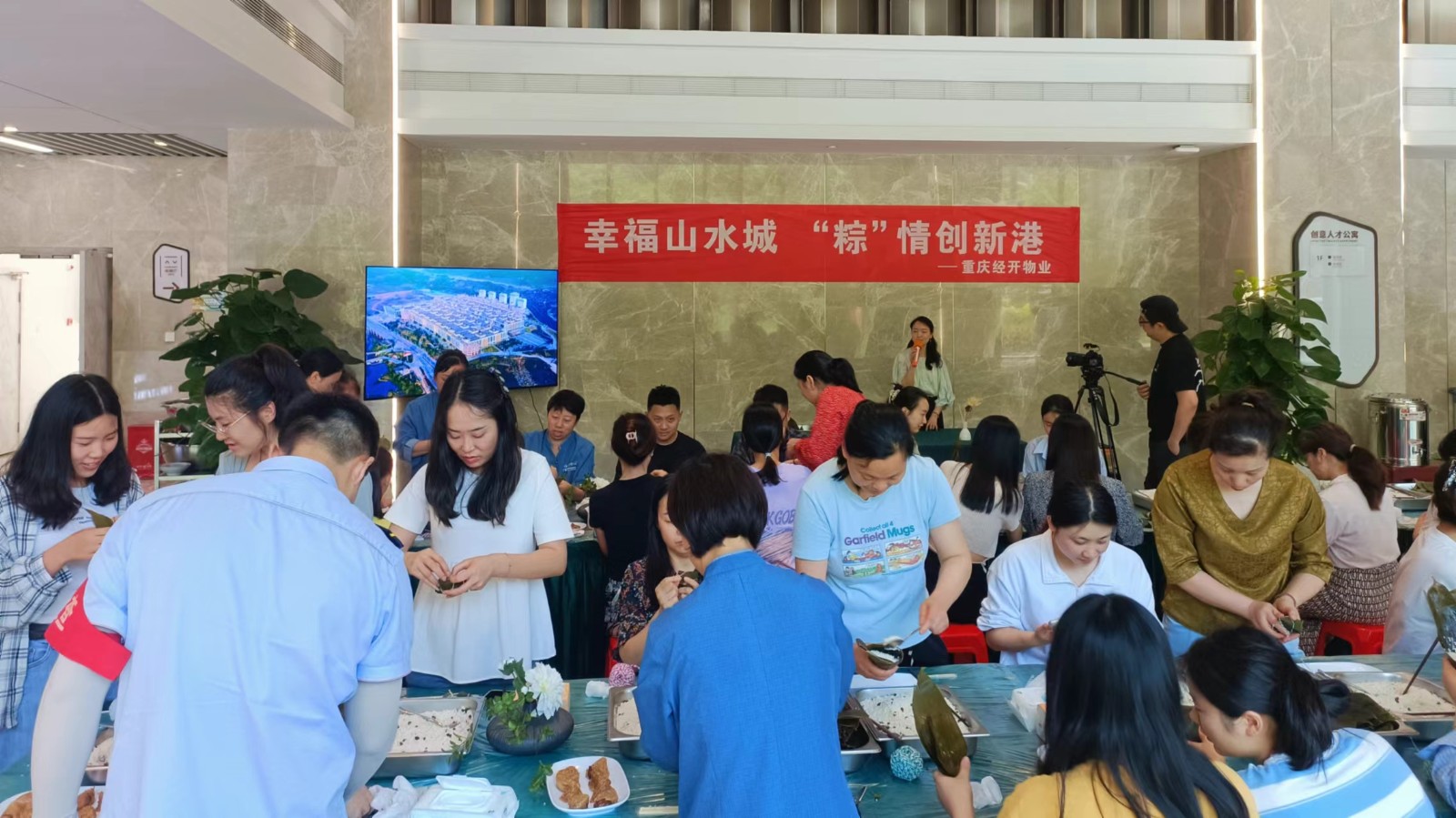 6月6日下午,重庆经开区物业管理有限公司在迎龙创新港园区精心组织了“幸福山水城,‘粽’情创新港!”包粽子活动。此次活动共邀请了园区入驻的11家单位,约80人到场参与。活动内容包括传统文化打卡、DIY包粽子、包粽子比赛以及小礼品发放和合影留念,共计五个互动环节。