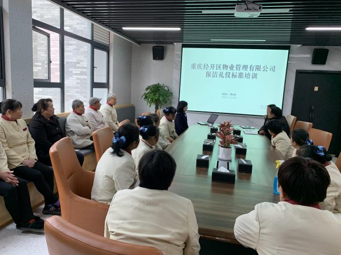 为提升保洁员工整体素质,提高保洁服务质量,重庆经开区物业管理有限公司环境部于2021年12月29日下午,组织保洁人员共计23人在物业办公楼二楼会议室开展《保洁专业基础知识》和《保洁礼仪标准》培训。通过基础知识学习和实践操作演练,保洁员工对保洁服务有了新的认识,进一步增强了服务意识,规范了工作标准,强化了细节服务,促使在今后日常保洁工作中保洁质量和工作效率更加规范化、标准化。
